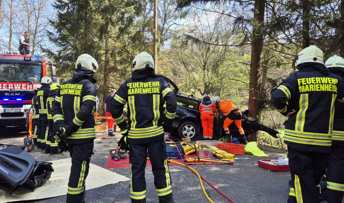 Gegen 13 Uhr wurde ein 22-jähriger Autofahrer in seinem Volvo eingeklemmt, nachdem er am Ende einer leichten Rechtskurve nach links von der Leppestraße (L 97) abkam und in Marienheide-Hütte gegen einen Baum prallte. Laut Polizei vor Ort wurde der Fahrer im Fußraum eingeklemmt. Die Feuerwehreinheiten Kalsbach, Kempershöhe und Marienheide rückten mit hydraulischem Spezialgerät an. Erst nach über einer Stunde konnte der Mann aus dem Wrack befreit werden.