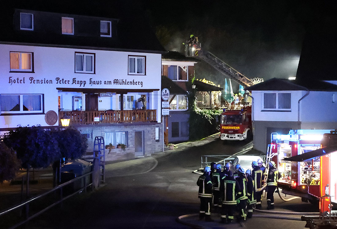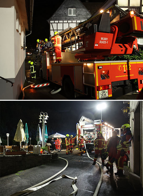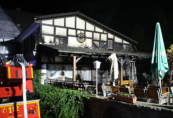 Waldbröl - 60 Feuerwehrleute hatten Feuer auf Hotel-Terrasse in Vierbuchermühle rasch unter Kontrolle - Niemand wurde verletzt.