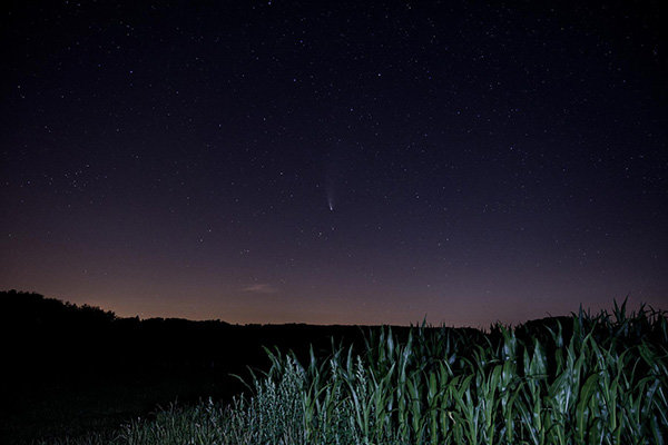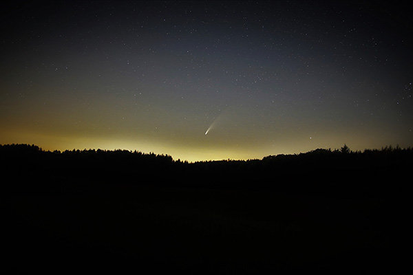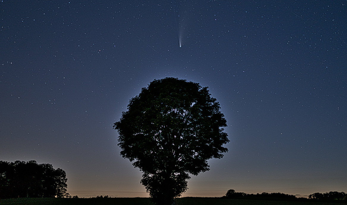 „Besonders hier im oberbergischen Kreis gibt es noch viele Stellen, an denen sich die Lichtverschmutzung noch in Grenzen hält und die Möglichkeiten für tolle Astrofotografien durchaus gegeben ist“, schreibt Heinz. Um die Aufnahmen von „Neowise“ zu machen, fuhr er mit seiner Ausrüstung auf einen kleinen Bergrücken zwischen den Ortschaften Reichshof-Lüsberg und Hassel. Dort hielt er Ausschau. „So gegen 0 Uhr war denn endlich der Zeitpunkt gekommen, wo man diesen Kometen mit ein bisschen Übung mit bloßem Auge am Nachthimmel sehen konnte.“