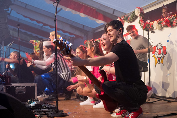 Nach seinem Auftritt begann die Musikkaskade. Mit den „Domstürmern“, den „Räubern“, die den Kultschlager „Ohne Dich“ auf Kölsch sangen, und „Kasalla“, die auf ihrer Beerdigung „Alle Jläser huh“ und „“Ich will Dich danze sehn“ hören möchten, wie Sänger Bastian Campmann verriet. Die „Dancing Daddys“ aus Frielingsdorf lösten ebenso heftige Begeisterungsstürme aus, waren jedoch nicht das einzige Highlight des Programms. Das ist nicht an allen vier Tagen gleich, aber immer sehr gut. So kamen am dritten Sitzungstag die „Brings“ aus Köln angefahren, „Kempes Feinest“ hatten auch ein „Mädche vum Rhing“ mit auf der Bühne und die „Paveier“ ihre Gassenhauer „Leev Marie“ und „Es muss ja nicht für immer sein“ im Gepäck.