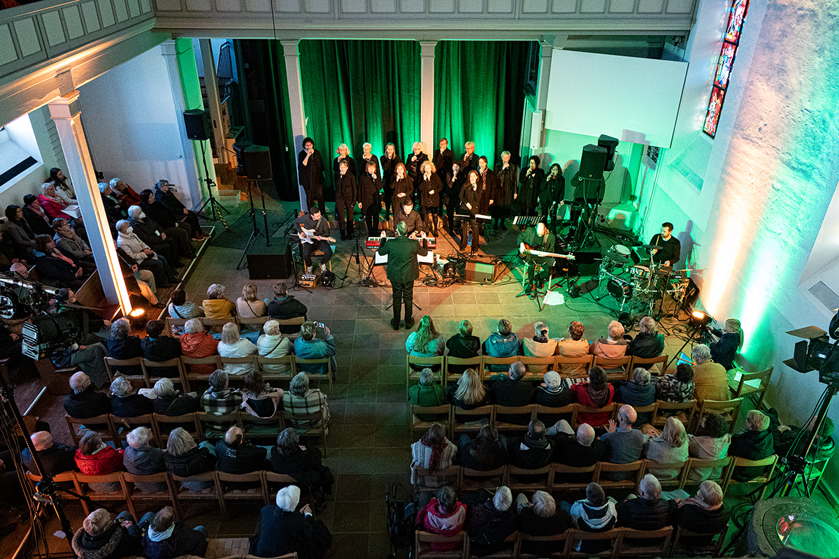 Müller-Ebbinghaus dirigierte nicht nur, sondern war teilweise auch als Sänger im Einsatz, um die Männerstimmen zu unterstützen. Unter Begleitung der Band mit Leon Zurawski (Gitarre), Markus Müller (Bass), Sven Krüger (Keyboard) und Lukas Krüger (Drums) wurde ein vielfältiges Programm geboten. Auf „On Calvary“ von Gäbler das „On the Cross of Calvary“ des Norwegers Tore W. Aas.