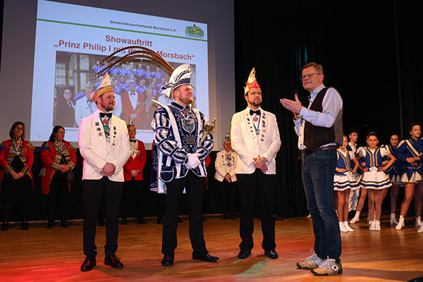Nach der Mannschaftsehrung wurde es Blau-Weiß in der Kulturstätte. Grund dafür war der Besuch der KG Morsbach, die mit Prinz Philip I. und seinem Gefolge einmarschierte. Nach der Begrüßung der Gäste mit einem dreifachen „Mueschbech Deheem“ zeigten das Tanzpaar und die Garde Blau-Weiss akrobatische Höchstleistungen.