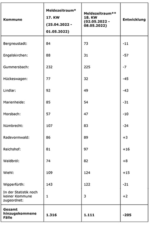 ** Die Daten entsprechen dem Stand, den das Gesundheitsamt des Oberbergischen Kreises am heutigen Morgen für den vorliegenden Wochenbericht ermittelte.