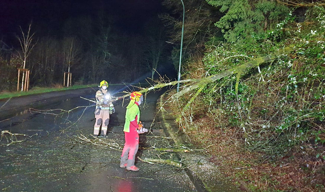 Die Polizei meldet seit gestern Abend 26 wetterbedingte Einsätze. Meistens rückte man wegen auf Autos gestürzter Bäume aus (zehn Einsätze). Dreimal waren Fahrzeuge mit Bäumen kollidiert. In den übrigen Fällen unterstützte man die Feuerwehr, um Straßen abzusperren. Verletzte gab es nicht zu beklagen.