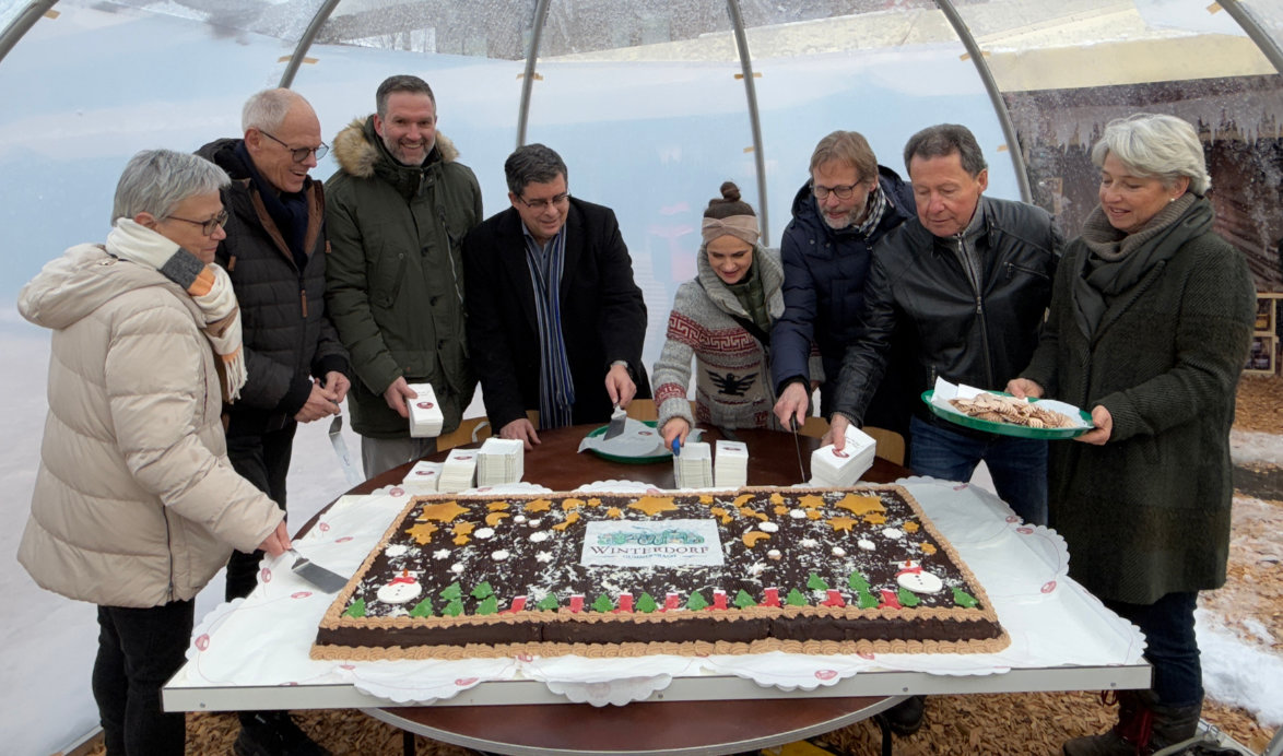 Eine Köstlichkeit bot Hartmut Lange anlässlich der Eröffnung an. Er hatte im Rahmen des 100. Jubiläums seiner Bäckerei und als einer der Sponsoren einen großen Kuchen gebacken, der zur Feier des Tages mit allen Beteiligten angeschnitten und gratis unter den Gästen verteilt wurde. Hergerichtet wurde der Platz des Winterdorfs durch Haushaltsmittel der Stadt, zur Realisierung trugen außerdem unter anderem die Volksbank Oberberg, die AggerEnergie und die Sparkasse Gummersbach bei.