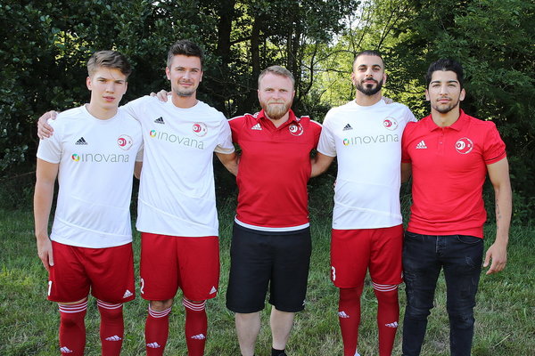 [Sergej Zimmerling mit den Neuzugängen Niklas Jung, Calvin Dillmann, Resul Durmus und Nasim Lakraa.]
