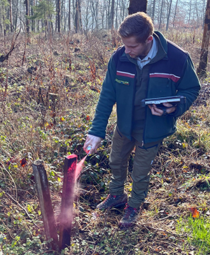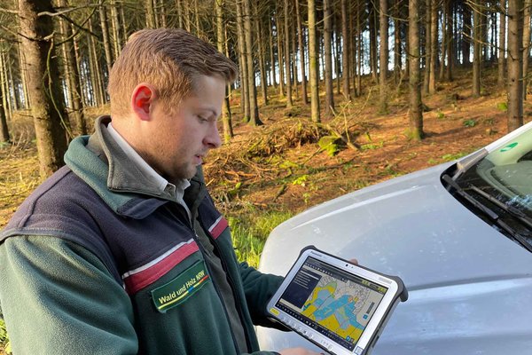 Ein Anruf bei Mitarbeiter Moritz Bilsing verrät ihm das nächste Ziel mitten im Wald oberhalb des Ortsteils Strombach: Im Dickicht ist Bilsing mit Tablet-PC und Sprühdose unterwegs, um Grenzen zu markieren. Anhand von Karten enträtselt er den Flickenteppich der Gebietskörperschaften. „Durch Erbengemeinschaften ergibt sich oft ein kurioses Bild“, berichtet Bilsing. Denn die teilweise jahrhundertealten Privatwaldgebiete sind teilweise so zerklüftet, dass mit bloßem Auge keine Eigentumsbestimmung mehr möglich ist. Damit es nicht zu Verwechslungen oder Überschneidungen kommt, werden die Grenzen für die anrückenden Waldarbeiter deutlich gekennzeichnet.