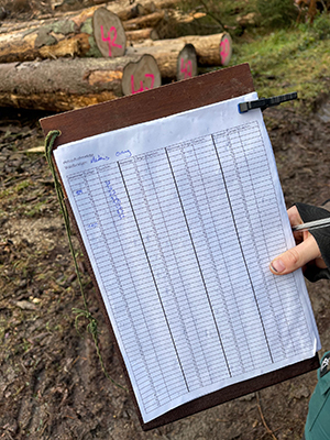 „Wir katalogisieren die am Wegesrand abgelegten und bereits zurechtgeschnittenen Baumstämme für den Weitertransport“, erklärt Günther. Während sie mit Spezialgerät Plättchen mit fortlaufenden Nummern auf die Stämme hämmert, notiert ihre Kollegin Pracht die Zahlenfolge auf einem Zettel mit dem Namen des dazugehörigen Waldbesitzers. „Die Daten werden später digitalisiert und sind dann stets abrufbar“. Wie wichtig die Arbeit der Hilfskräfte ist, betont Chef Michael Cescotti vor Ort: „Jeder Waldbesitzer muss akribisch zugeordnet werden, um für sein Holz auch bezahlt zu werden“, ein kleiner Fehler spiegelt sich in der Endabrechnung wider, die oft erst Monate später beim Eigner eintrifft. „Eine Rückverfolgung des in diesen Tagen meist nach China exportierten Holzes ist dann fast unmöglich“, weiß Cesotti aus Erfahrung.