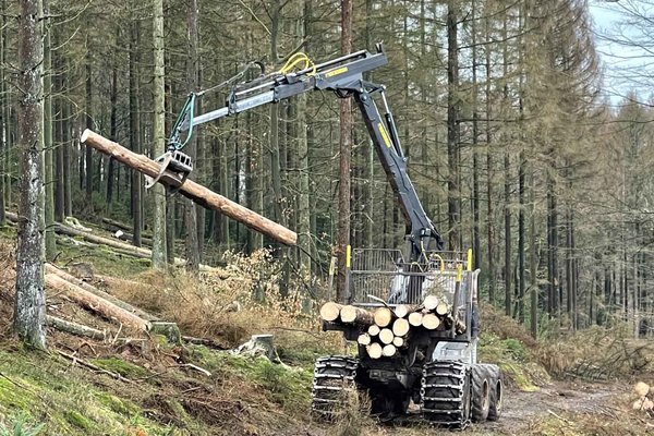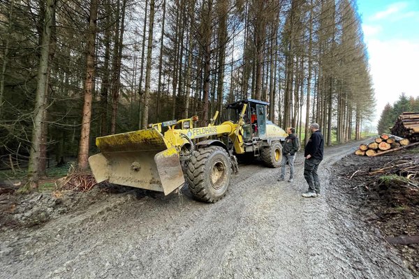 Schnell geht es im eng getakteten Tagesprogramm weiter. Zu den Aufgaben eines Revierförster gehört auch die Überwachung von laufenden Arbeiten. Mit dem erwähnten Gräder zieht Bau-Maschinist Matthias Stöwer seine Bahnen durch den Wald und füllt die Furchen mit reichlich Splitt. Der Schmallenberger ist als Dienstleister bundesweit unterwegs, dreimal im Jahr kommt er ins Oberbergische. Cescotti erkundigt sich kurz nach dem Arbeitsfortschritt, steigt in sein Auto und braust zur nächsten „Baustellenkontrolle“ auf einem Höhenkopf in der Nähe. Dort steht ein riesiger "Rückzug", wie er in diesen Tagen häufig zum Einsatz kommt.