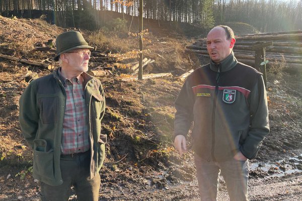 Nach kurzer Rücksprache der beiden geht es für den Revierförster flugs voran, denn er hat einige Kilometer weiter einen Ortstermin mit Rolf Kritzler, dem Vorsitzenden der Forstbetrieb-Gemeinschaft (FBG) Gimborn. Die FBG ist die Interessengemeinschaft der Waldbesitzer und stellt Finanzmittel zum Beispiel für die Wiederherstellung von Wirtschaftswegen zur Verfügung. Vor Ort begutachtet man die durch den Abtransport von Holz entstandenen Furchen im Boden, die kurzfristig durch einen sogenannten Gräder beseitigt werden. Auf "kurzem Dienstweg" ist die Baumaßnahme schnell beschlossen. „Die Zusammenarbeit funktioniert hervorragend“, so Cesotti. Aus dem Kollegenkreis weiß er, dass eine einfache Abwicklung keine Selbstverständlichkeit ist und dass es deutschlandweit betrachtet „Querköpfe“ gibt, durch die Prozesse unnötig verlängert werden. Hier sei es glücklicherweise anders, man ist seit vielen Jahren "per Du“ und besiegelt die Finanzierung von Maßnahmen per Handschlag.