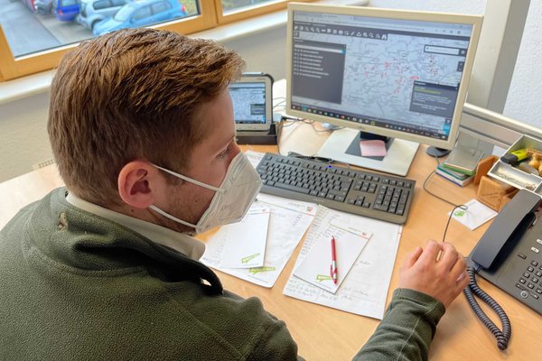 [Am Computer sucht Moritz Bilsing am Morgen die Waldgebiete,...]