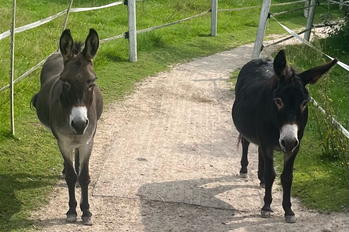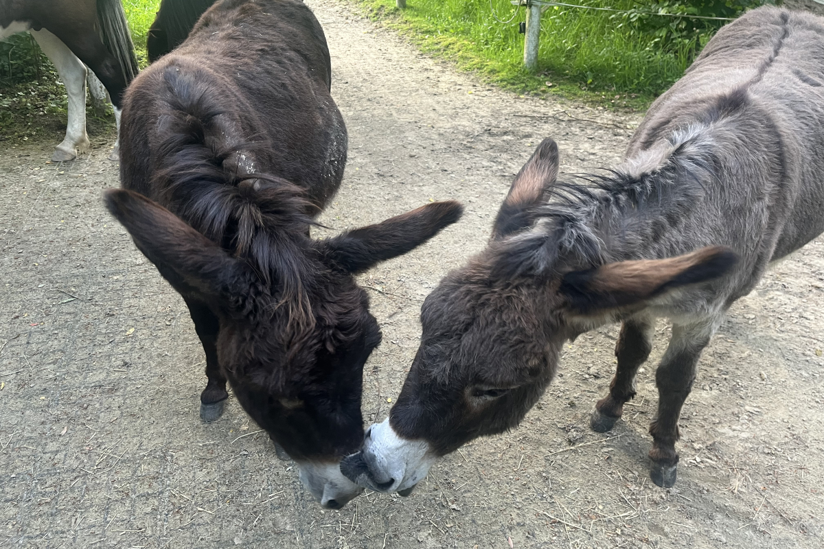 Kaum hat man das Grundstück betreten, warten am Gatter die Esel Tore und Floki (Foto rechts), die neugierig und freundlich reagieren. „Da geht jedem das Herz auf“, könnte Mertens die Begrüßungsszene kaum treffender umschreiben. Eines der Tiere schnuppert an den Händen der Besucher und fordert die Gäste auf, ihn zu streicheln, während sein Artgenosse die Szene mit etwas räumlichen Abstand beäugt. „Obwohl es die gleichen Tiere sind, haben sie unterschiedliche Charakter“, meint die 49-Jährige. Und genau hier sieht sie den Ansatz für ihr Angebot, das ab Sonntag, 1. September, für jedermann zugänglich gemacht wird. Man müsse lernen, das Verhalten der Hofbewohner zu verstehen und sie auf die Klienten zukommen lassen.