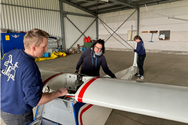 [Gemeinsam setzen die Ehrenamtler einen im Winter auf Herz und Nieren überprüften Segelflieder zusammen, um bald wieder abheben zu können.]