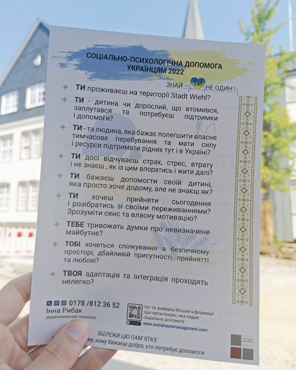 Unterstützt wird Rybak von Valeria Schröck. Sie ist duale Studentin der Sozialen Arbeit und ebenfalls beim Decker Sozialraummanagement tätig. „Ich bin mit der russischen Sprache aufgewachsen, da meine Mutter ursprünglich aus Russland stammt.“ Seit einem halben Jahr besuche sie außerdem einen Sprachkurs, um ihre Kenntnisse zu vertiefen. Mit Rybak tausche sie sich auf Russisch aus, helfe bei der Verständigung mit Arbeitskollegen und weiteren Gesprächspartnern. Für ukrainische Geflüchtete in Wiehl ist nun auch ein Flyer entwickelt worden, der über Rybaks Arbeit und diverse Angebote wie Einzel- und Gruppengespräche informiert. Dabei die ukrainische und nicht die russische Sprache zu nutzen, sei der Community laut Decker sehr wichtig gewesen.
