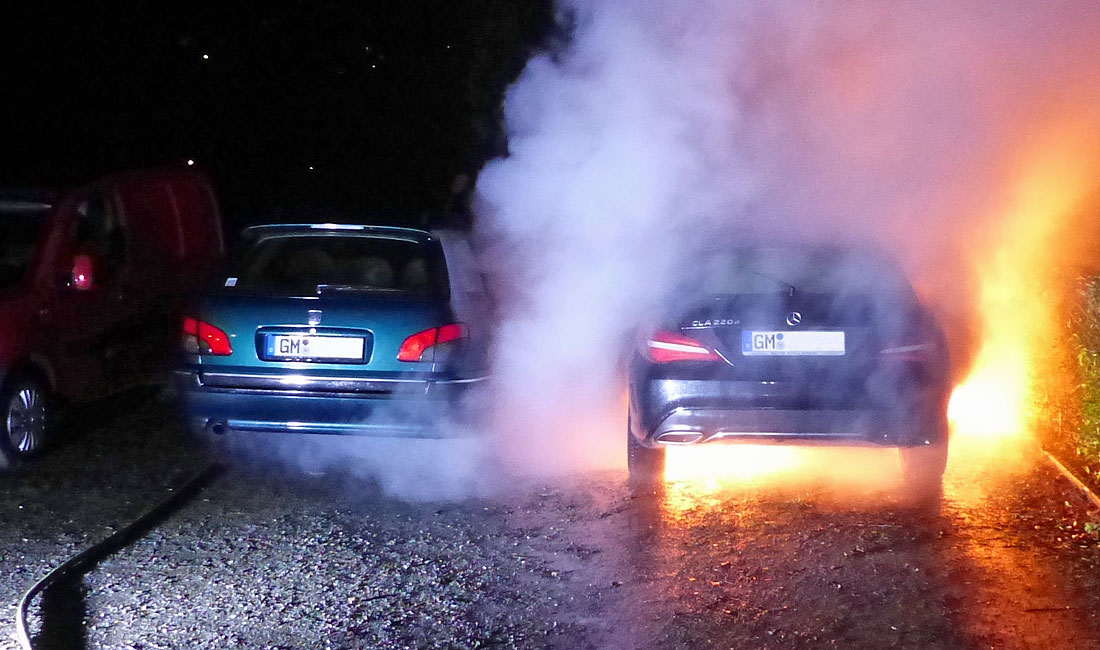 Am Montagmorgen gegen 4:30 Uhr waren Anwohner der Homburger Straße in Waldbröl durch einen lauten Knall aufgeschreckt worden und hatten einen brennenden Mercedes entdeckt. Die Feuerwehr konnte das Übergreifen des Feuers auf einen in unmittelbarer Nähe stehenden Wagen verhindern, doch durch die starke Hitzeentwicklung wurde auch an dieses Auto schwer beschädigt. Der Mercedes brannte zum großen Teil aus und besitzt nur noch Schrottwert. Ermittler der Polizei stellten fest, dass der Wagen an zwei Stellen in Brand gesetzt worden war. Zeugenhinweise an das Kriminalkommissariat 1 in Gummersbach unter Tel.: 0226/81 99-0.