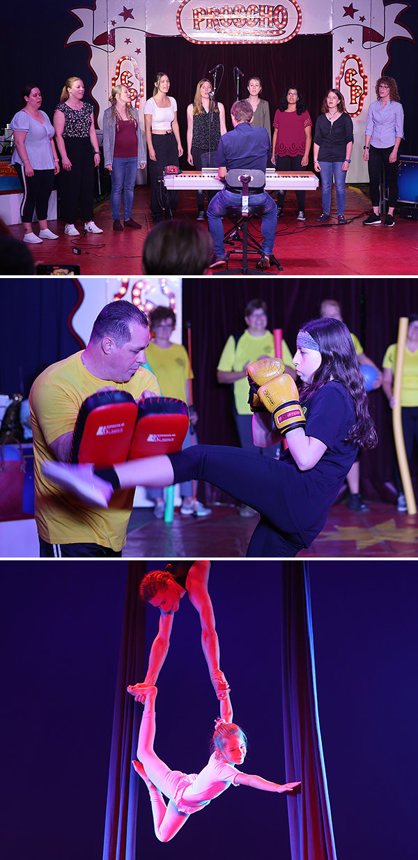 Zur Keyboard-Begleitung ihres Chorleiters Tobias Mauksch, rissen die Young Voices das Publikum mit modernen Pop-Arrangements zum begeisterten Klatschmarsch hin. Die Kinderturngruppe des TuS Othetal verwandelte die Zirkusmanege beim Laufspiel in ein Haifischbecken, die Mitglieder der Gruppe „Rückenfitness“ aktivierten mit Ball, Schwungstab, Gewichten und Pool-Nudeln ihre Wirbelsäulen.