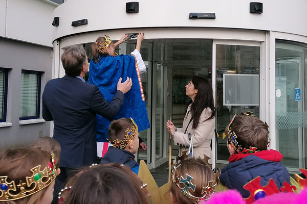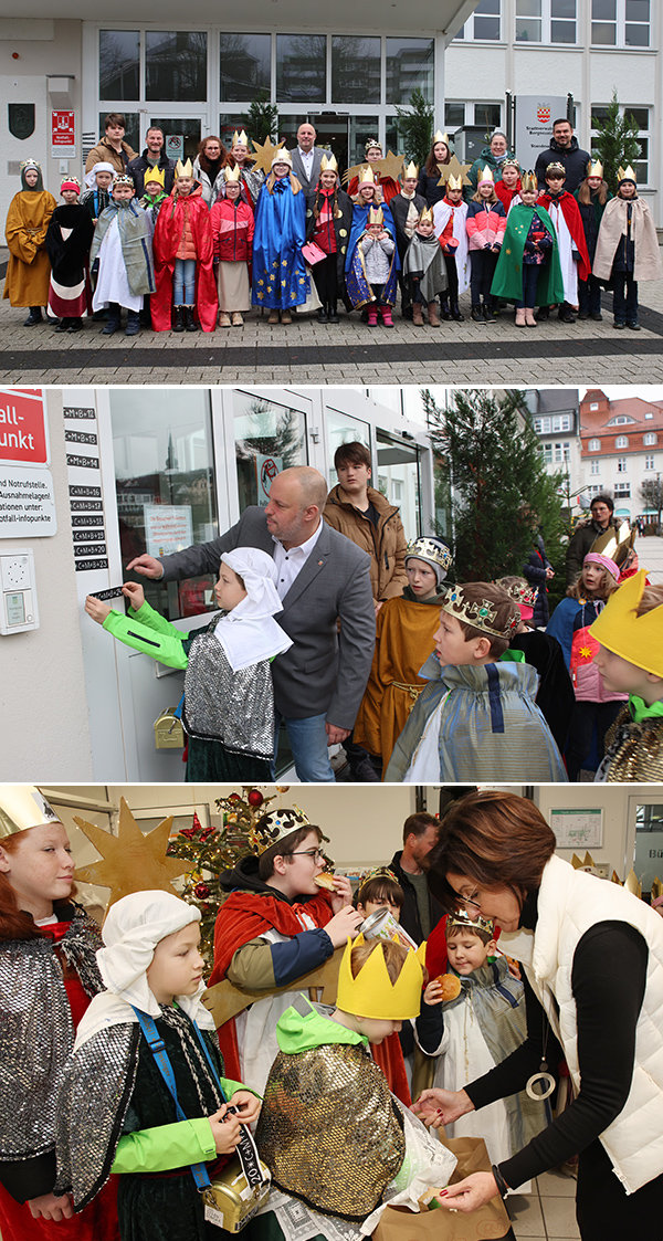 Nachdem die Kinder den Segensspruch „20*C+M+B+24“ am Eingang zum Rathaus angebracht hatten, zogen die vielen heiligen drei Könige Caspar, Melchior und Balthasar noch in kleinen Gruppen mit ihren Sammelbüchsen von Büro zu Büro. Dort verkündeten sie den Bediensteten ihre Segenssprüche und baten um eine Spende für die Sammelbüchse und brachten ihren Segensspruch über den Bürotüren an. Thuls Sekretärin Heike Schulze verteilte Schokobrötchen an Königskinder. (mkj)