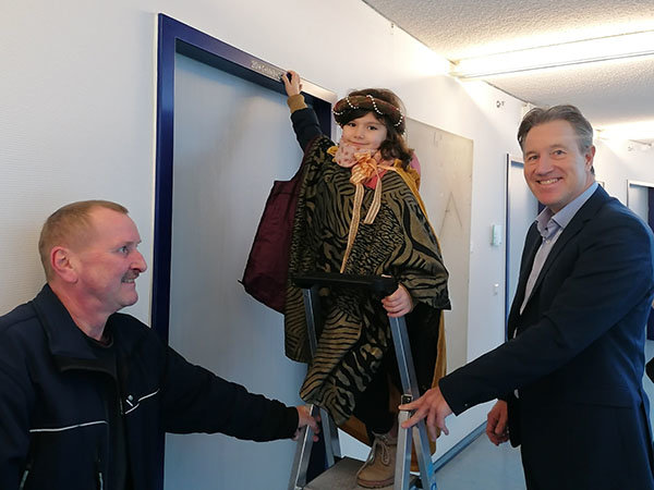 Gesegnet wurde am Kreishaus nicht nur der Haupteingang, an dem Johanna einen Aufkleber mit der Aufschrift „20*C+M+B+24“ anbrachte. Zusammen mit Schmallenbach, der die Segensbringer am gestrigen Donnerstag erstmals empfing, zogen mit Anna und Lotte zwei der Sternsinger zu den Büros von Landrat Jochen Hagt und Kreisdirektor Klaus Grootens, deren Türenrahmen ebenfalls mit Aufklebern versehen wurden.