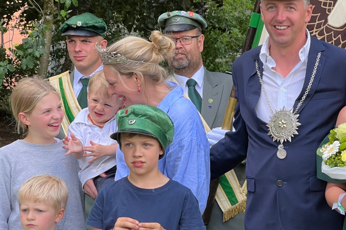 Trotzdem riss der überglückliche Schütze nach seinem finalen Treffer die Arme in die Höhe und ließ sich von seinen Kameraden der Kompanie Mühlenseßmar enthusiastisch feiern, ehe der Vater von vier Kindern seiner Ehefrau und künftigen Königin Victoria in die Arme fiel. Im Hintergrund jubelten ihm Hunderte Grünröcke zu. Björn Stade ist 42 Jahre alt, Gastronom und lebt mit seiner Familie im Stadtteil Strombach. Er ist seit 18 Jahren Mitglied im Gummersbacher Schützenverein. Die Idee, auf den Vogel zu schießen, kam dem neuen Regenten während des Königsballs gestern Abend spontan. Schnell war daraufhin ein möglicher Hofstaat organisiert: „Et kütt wie et kütt und ich bin einfach nur froh“, so seine Worte kurz nach seinem schnellen Triumph.