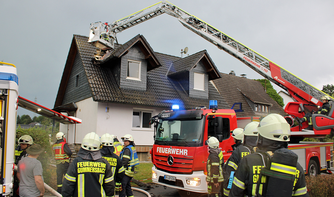 Etwa 40 Einsatzkräfte der Feuerwehr Gummersbach unter der Leitung des stellvertretenden Wehrleiters Thomas Wurm waren am frühen Abend in Dieringhausen im Einsatz. Zunächst war nach einem Blitzeinschlag in ein Wohnhaus ein Dachstuhlbrand gemeldet worden. Dies bewahrheitete sich zum Glück nicht.