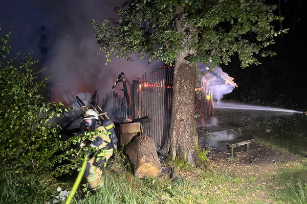Fotos: Feuerwehr Nümbrecht/Wiehl --- Zwischen Drabenderhöhe und Oberstaffelbach hat eine Fischerhütte gebrannt.