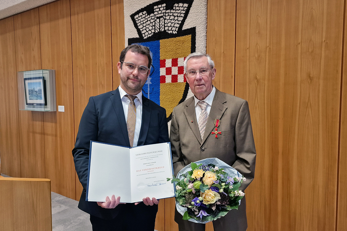 Rolf Fiedler hat am heutigen Samstagvormittag das Bundesverdienstkreuz am Bande erhalten. Der stellvertretende Landrat Tobias Schneider verlieh ihm in Vertretung des erkrankten Landrats Jochen Hagt die Auszeichnung drei Tage vor seinem 86. Geburtstag im Rahmen einer Feierstunde im Ratssaal des Gummersbacher Rathaus. Der Gummersbacher hat durch sein jahrzehntelanges Engagement Verdienste im sportlichen Bereich erworben.
