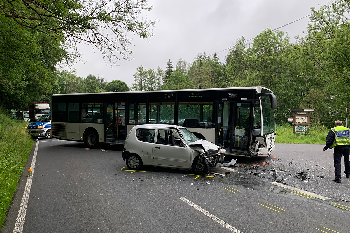 Dabei kam es zum Zusammenstoß mit dem entgegenkommenden Fiat Seicento eines 19-jährigen Windeckers., der auf der L 326 zuvor ein anderes Auto überholt hatte, wie die Polizei mitteilt. Durch die Wucht des Aufpralls erlitt der Fiat-Fahrer leichte Verletzungen, seine 17-jährige Beifahrerin wurde schwer verletzt. Beide wurden zur weiteren Behandlung ins Krankenhaus gebracht. Der Busfahrer sowie die drei minderjährigen Fahrgäste kamen mit dem Schrecken davon.