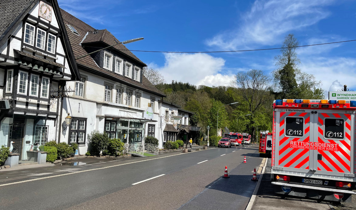 Schrecksekunde für die Haustechniker im Windhagener Hotel Wyndham Garden: Im leerstehenden Gebäude hatte ein Mitarbeiter gegen 15 Uhr Chlorgeruch im Schwimmbad des Hauses im Keller wahrgenommen, wie Gummersbachs Feuerwehrchef Frank Raupach vor Ort berichtete. Er wurde mit den hauptamtlichen Kräften aus der Kreisstadt, der Einheit Windhagen sowie dem Messzug aus Brunohl in den Gummersbacher Stadtteil gerufen.