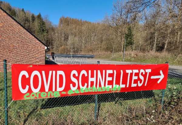 Jan Geisler, Inhaber der erst am vergangenen Freitag eröffneten Corona-Teststelle im „Hammerwerk“ in Engelskirchen-Bickenbach, fiel heute Morgen aus allen Wolken: Unbekannte hatten die Einfahrt sowie drei Banner mit Farbe besprüht. Zu lesen ist unter anderem „corona-ausschuss.de“ und „reitschuster.de“. Geisler erstattete Anzeige bei der Polizei, die für Ermittlungen vor Ort war. „Beschmierungen sind wir leider gewohnt. Dass in unserem kleinen Ort aber politisch motivierte Taten verübt werden, schockiert mich“, erklärt Geisler. Den entstandenen Schaden schätzt er auf rund 700 Euro.