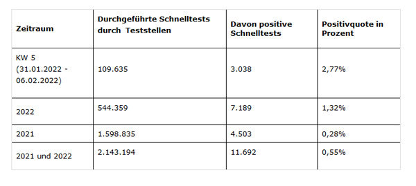Die Zahl der durchgeführten Corona-Bürgertests in der Region lag in der vergangenen Kalenderwoche (31. Januar bis 6. Februar) bei 109.635 (Vorwoche: 108.607). Davon waren nach Angaben der Kreisverwaltung 3.038 positiv, was einer Quote von 2,77 Prozent entspricht und einen neuen Höchstwert seit Beginn der Bürgertestungen im März 2021 darstellt (Vorwoche: 2.294 positive Schnelltests, Quote: 2,11 Prozent).