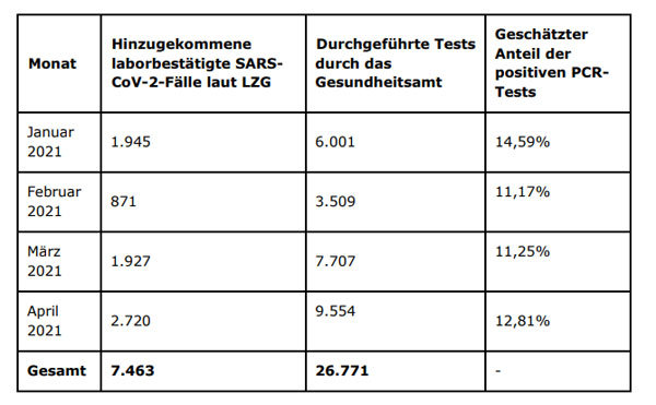 Von Januar bis April führte das Kreis-Gesundheitsamt 26.771 PCR-Tests bei Menschen aus Oberberg durch. Die Gesamtzahl kann die Kreisverwaltung nicht beziffern, da keine Statistiken darüber vorliegen, wie viele PCR-Tests in diesem Zeitraum in Kliniken und bei niedergelassenen Ärzten gemacht wurden. Im Vorjahr testete das Gesundheitsamt 45 Prozent der Infizierten selbst, die übrigen Tests fanden in Kliniken und bei Ärzten statt. Die in der nachfolgenden Tabelle genannte geschätzte Anteil der positiven PCR-Tests beruht auf der Annahme, dass diese Verteilung gleichgeblieben ist.