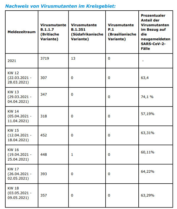 Der Oberbergische Kreis hat wie jeden Mittwoch eine Übersicht zu den Nachweisen von Corona-Mutanten veröffentlicht, allerdings gilt dabei zu beachten, dass sich die aktuellsten Daten auf die Kalenderwoche 18 (3. bis 9. Mai) beziehen. Demnach lag der Anteil der Infektionen mit der britischen Variante an der Gesamtzahl der neugemeldeten Ansteckungen bei 63,3 Prozent und damit ungefähr auf dem Niveau der Vorwochen. Die südafrikanische Mutante wurde laut Übersicht seit Ende März lediglich bei einer Person nachgewiesen, die brasilianische gar nicht.
