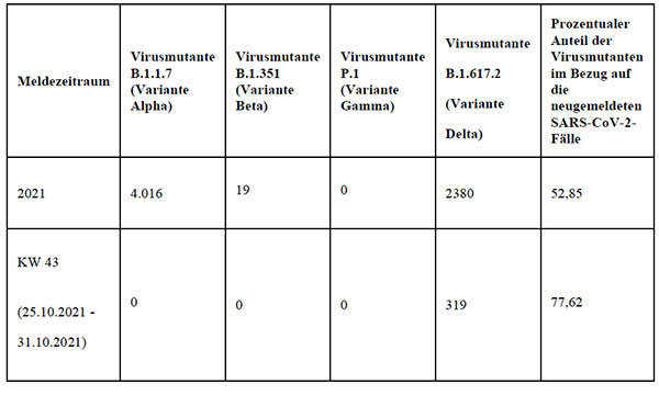 Die neueste Auswertung des Oberbergischen Kreises über die nachgewiesenen Virusmutanten in der Region aus der Kalenderwoche 43 (25. Oktober bis 31. Oktober) zeigt, dass die Delta-Variante weiterhin dominierend ist. Alle 319 Menschen, bei denen im genannten Zeitraum eine Mutante nachgewiesen wurde, haben sich mit dem erstmals in Indien aufgetretenen Typ angesteckt. Andere Varianten wurden in diesem Zeitraum - wie schon in den Wochen zuvor - nicht festgestellt. 77,62 Prozent der neu gemeldeten Infizierten trugen laut Analyse der Laborergebnisse die Delta-Mutante in sich. Hier ist eine Übersicht zum Nachweis von Virusmutanten zu finden.