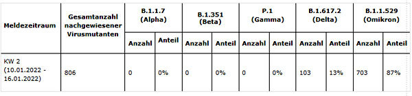 Bereits in der zweiten Kalenderwoche des Jahres (10. bis 16. Januar) ergab die Typisierung der positiven Proben, die dem Gesundheitsamt bekannt waren, dass der Omikron-Anteil bei 87 Prozent lag, bei den übrigen 13 Prozent wurde die Delta-Variante bestätigt.