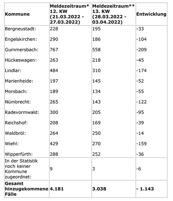 Die nachfolgende Tabelle zeigt die Verteilung der im jeweiligen Meldezeitraum gemeldeten laborbestätigten Fälle auf die Kommunen des Oberbergischen Kreises.