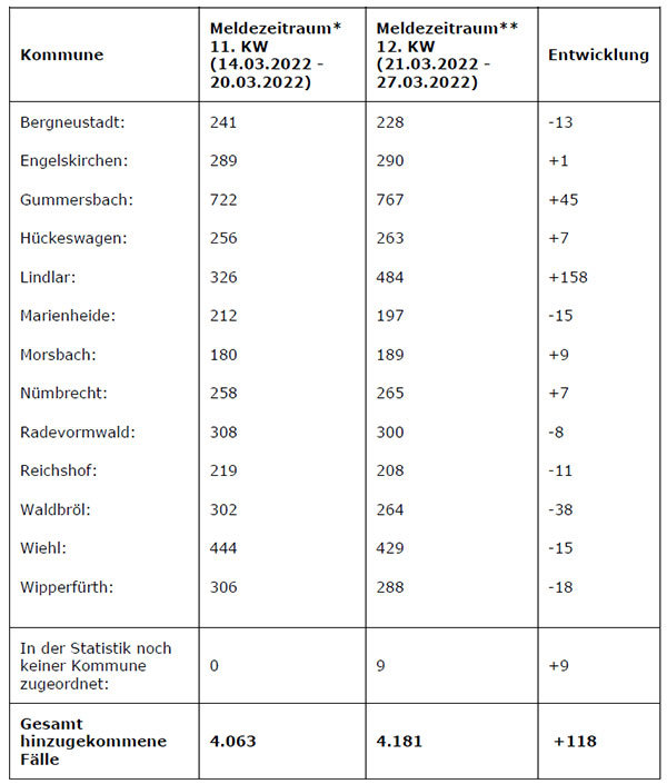 Die nachfolgende Tabelle zeigt die Verteilung der im jeweiligen Meldezeitraum gemeldeten laborbestätigten Fälle auf die Kommunen des Oberbergischen Kreises.