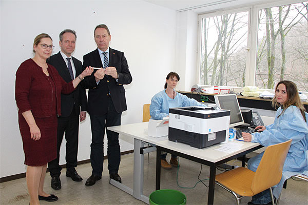 [Foto: OBK --- Landrat Jochen Hagt (M.), Kreisdirektor Klaus Grootens (2.l) und die Leiterin des Gesundheitsamtes des Oberbergischen Kreises, Kaija Elvermann, nahmen vor Inbetriebnahme die Räume zur Testung in Augenschein.]