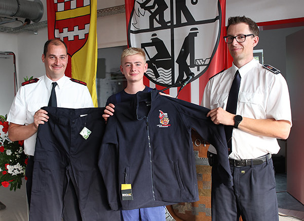 [Als Gruppenführer der Jugendfeuerwehr nahm Lukas Stricker (Mitte) eine erste Ausgeh-Uniform entgegen.]