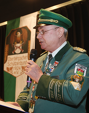 Anschließend nahm der OSB-Präsident Büser die Gäste mit auf die Reise durch 100 Jahre Werden und Wachsen des Oberbergischen Schützenbrauchtums, das auf 1.200 Seiten in der aktuell aufgelegten Chronik (OA berichtete) dokumentiert worden ist (Erwerb über die Vorsitzenden der Oberbergischen Schützenvereine oder osb1924.de).
