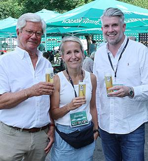 [Der Beiratsvorsitzende und ehemalige Geschäftsführer der Erzquell Brauerei, Dr. Axel Haas (li.), und seine Nachfolger in der Geschäftsführung, Christina Haas und Sebastian Brack, stießen auf eine gelungene Feier an.]