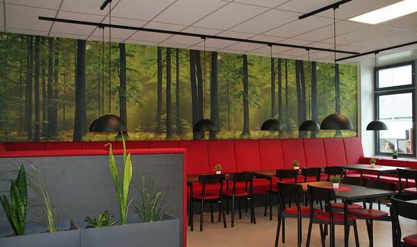 Die Mensa der Gesamtschule Reichshof in Eckenhagen wird von Schülern sowie den Besuchern des Kulturforums rege genutzt, die Gestaltung der Räumlichkeiten versprühte aber eher den Charme der 1970er-Jahre. Deshalb hat die Gemeinde Reichshof als Schulträger für die Sommerferien eine Neugestaltung und die komplette Renovierung geplant. In der Vorbereitung wurde eine Arbeitsgruppe gegründet. Das vom Gebäudemanagement vorgeschlagene Konzept, dem Raum mittels Fototapeten Tiefe und einen Blick in die Reichshofer Landschaft zu geben, fand bei allen Beteiligten sofort Anklang. Der Oberbegriff "Natur und Landschaft" bildete die Basis für das Konzept zum Wohlfühlen.