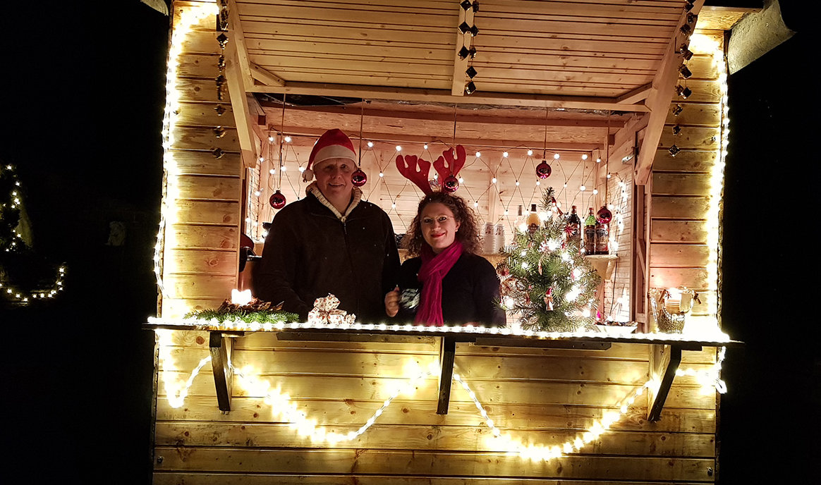 Die selbst gebaute Hütte diente zur Feier des 55. Geburtstags von Ralf Haase im vergangenen Jahr als Wurfbude. „Damals meinten unsere Gäste schon zu uns: Die würde sich auch gut als Glühweinstand machen“, erzählt Haase. Daran erinnerten sie sich, als klar wurde, dass Ausflüge auf Weihnachtsmärkte in diesem Jahr ausfallen werden. Kurzerhand wurde die Hütte noch etwas umgebaut und nun hebt sich die Klappe alle paar Abende und das festliche Licht erleuchtet die Nacht. Zum Glühwein machen sich Sonja und Ralf Haase gerne auch mal Champignons mit Knoblauch, gebrannte Mandeln oder Reibekuchen. „Wir wollten einfach das Beste aus der Situation machen in Corona-Zeiten“, sagt Sonja Haase.