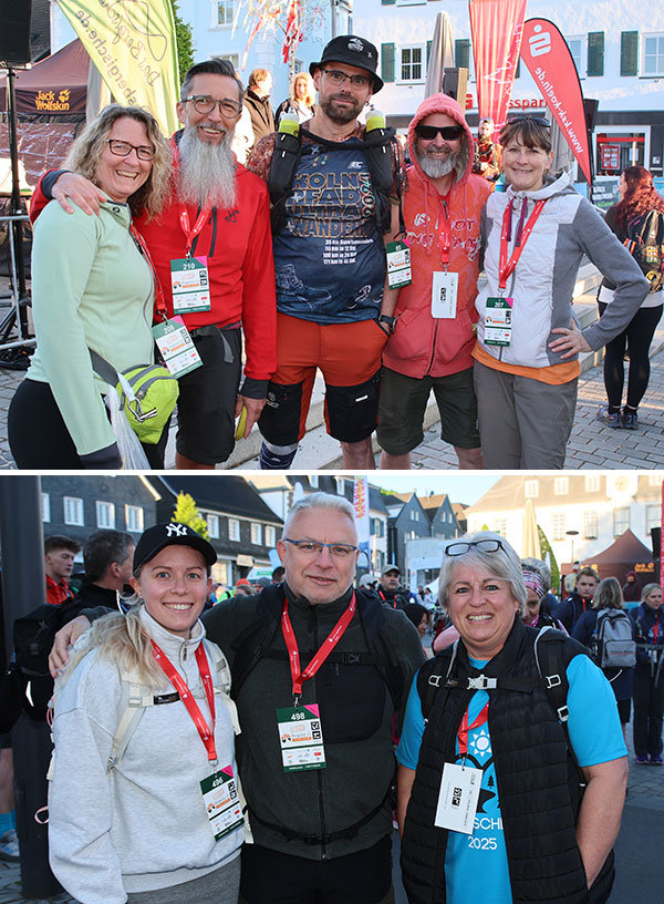 Auch unter den Aktiven ist die Stimmung früh am Morgen ausgelassen und die Motivation spürbar. Kirsten aus Wuppertal ist mit einer Gruppe von rund zehn Wanderfreunden angereist: „Wir haben es vor drei Jahren das erste Mal gemacht und seitdem sind wir hiervon angesteckt.“ Ronny Strehle aus Hückeswagen wurde von seiner Familie regelrecht überrascht: „Meine Töchter sind 2024 mitgelaufen und haben einfach die Anmeldung für uns alle fertig gemacht. Da hatte ich keine Chance nein zu sagen – und jetzt sind wir heute dabei.“ Auch die für den Tag angekündigte Hitze schreckt ihn nicht: „Ich denke, ich bin gut gerüstet.“