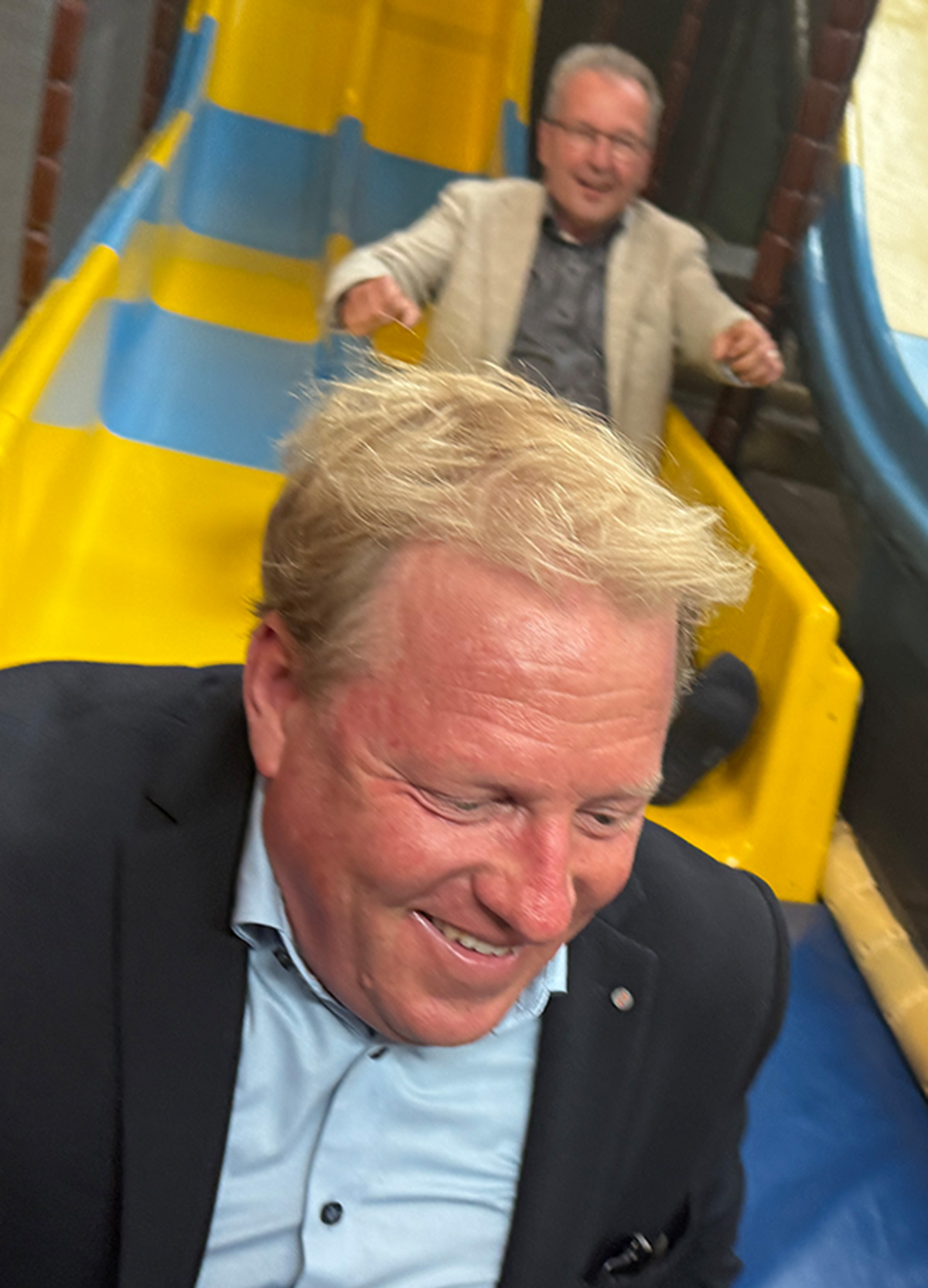 Zum Verlassen können zwei Rutschen genutzt werden, die Schmidt heute gleich mit Reichshofs Bürgermeister Rüdiger Gennies testete und nach dem „Rennen“ auf der steilen Variante die Nase vorn hatte (Foto links). Das, was so spielerisch daherkommt, ist für den Park eine der größten Investitionen der vergangenen Jahre. Liegt der Neuwert bei insgesamt etwa 300.000 Euro, fügte sich das Schicksal wohlwollend. „Vor vier Jahren haben wir einen Anruf einer Möbelfirma erhalten, die das Gerüst für den Spieleinsatz nicht mehr benötigte, und haben zugegriffen“, berichtete Schmidt. Nur ein Jahr später wurden auch die übrigen beiden Module erworben und von Herne nach Eckenhagen transportiert. Damit sei dem „Stiefmutterbereich der Indoorhalle“ - so bezeichnete ihn Parkgründer Dr. Werner Schmidt – neues Leben eingehaucht worden.