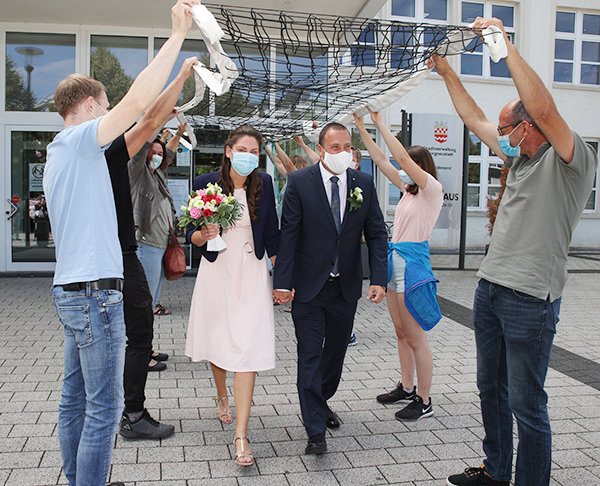 Es war ein imposanter und ungewöhnlicher Anblick, als am Vormittag ein Segelflugzeug auf dem Neustädter Rathausplatz stand, umrahmt von vielen Gratulanten aus dem Luftsportclub, die auf das Brautpaar warteten. Die beiden mussten nach der Trauung allerdings erst einmal durch ein Spalier der Volleyballer des TV Hackenberg schreiten. Auch dort sind sie gemeinsam sportlich aktiv. „Das Schöne ist, dass wir trotz Corona geheiratet haben und viele Freunde und die Familie dabei sein können“, freute sich die Jungvermählte, überrascht von den unzähligen Gästen, die sich versammelt hatten. „Damit habe ich gar nicht gerechnet. Alles super, ich bin einfach glücklich“, ergänzte der Ehemann mit einem strahlenden Lächeln.