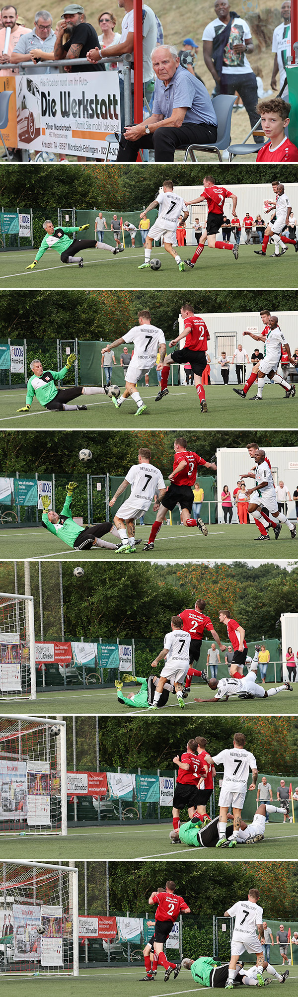 Der Organisator der Veranstaltung, Dominik Krämer, hatte in weiser Voraussicht einen großen Kader nominiert. Das sollte sich spätestens im Laufe des zweiten Durchgangs bemerkbar machen. Die Niederrheiner hatten nur einen Auswechselspieler und mussten den hohen Temperaturen Tribut zollen. Die Gastgeber markierten ihren ersten Treffer durch Sascha Dill (Sportfreunde Asbachtal). Fast im Gegenzug war es erneut Goumai, der den alten Abstand wieder herstellte. Danach konnte sich Michael Binder, der nun das Tor der Auswahl hütete, zweimal auszeichnen. In der Schlussphase übernahm die Mechtenberg-Equipe das Kommando. Reihenweise gute Möglichkeiten wurden vergeben, ehe Cono Caputo (Spvg. Wallerhausen) aus dem Gewühl den Schlusspunkt setzte.