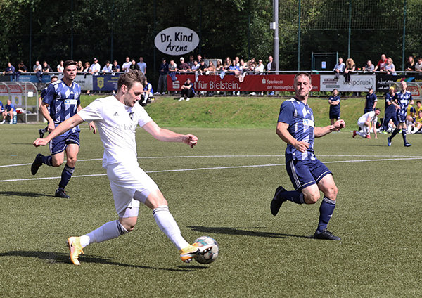 Doch die Bielsteiner schlugen zurück – und wie! Kevin Müller nahm aus knapp 40 Metern Entfernung Maß und überrumpelte damit den zu weit vor dem Tor postierten Schneider. Lange hielt die Freude über den Ausgleich aber nicht an: Der eingewechselte Kilian Seische netzte 60 Sekunden später zum 1:2 ein und führte sein Team damit auf die Siegerstraße. „Am Ende war der Erfolg verdient, doch wir haben uns lange schwergetan“, meinte Reisewitz.