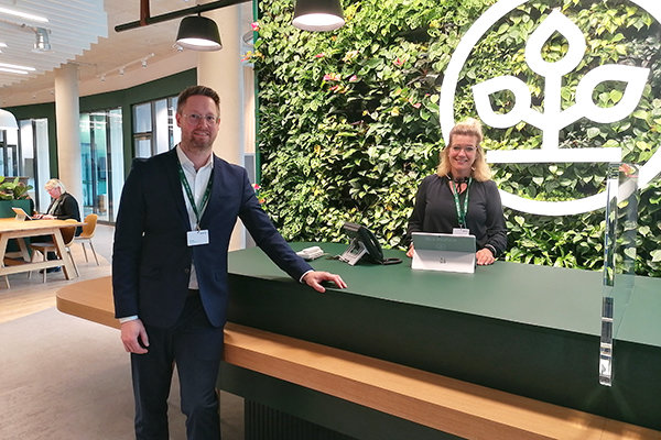 [Daniel Vankerkom (l.), stellvertretender Regionaldirektor, und Kundenberaterin Mira Neuhaus, im Eingangsbereich des neuen AOK-Hauses.]