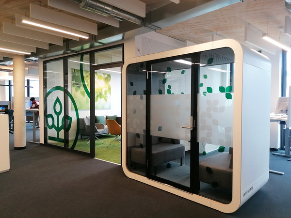 [Im neuen AOK-Haus gibt es weniger Arbeitsplätze als Mitarbeiter, Schreibtische werden miteinander geteilt. Darüber hinaus stehen Besprechungsräume sowie Telefon- und Meetingboxen zur Verfügung.]