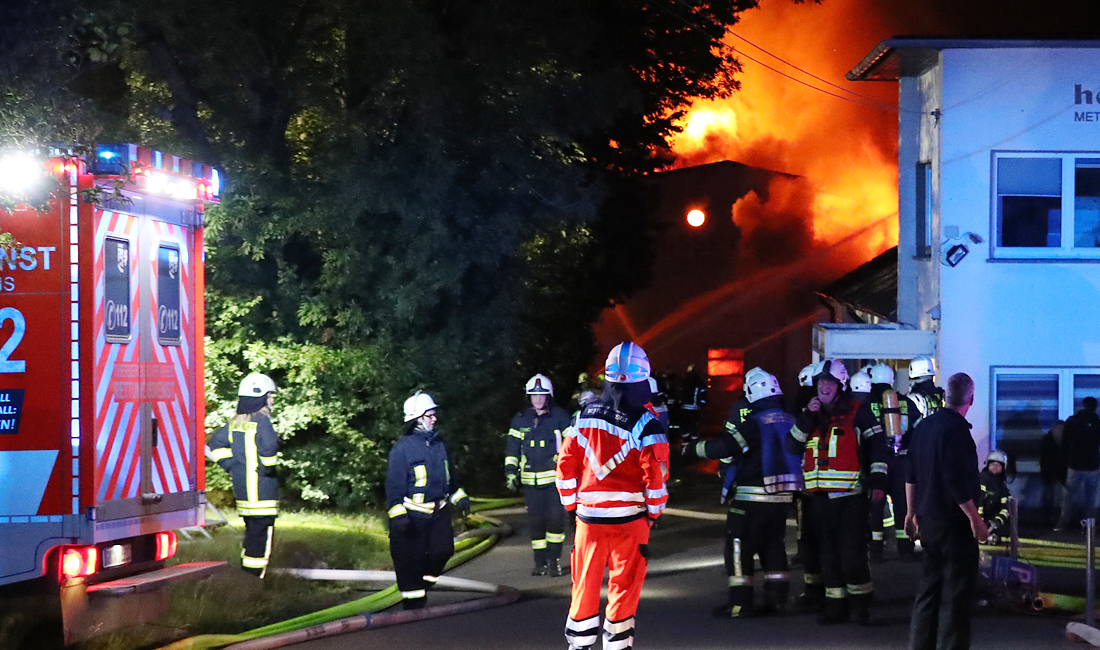 Marienheide - 176 Feuerwehrleute kämpften bis 6:45 Uhr bei der Firma Risse gegen das Feuer – Messungen ergaben ungefährliche Luftwerte (AKTUALISIERT).